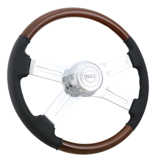 18″ Wood & Leather Rim, Chrome 4-Spoke w/Slot Cut Outs, Chrome Bezel, Chrome Horn Button, 3 Hole Wheel