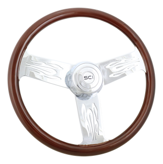 18″ Wood Rim, Chrome 3-Spoke w/Flame Cut Outs, Chrome Bezel, Chrome Horn Button, 3 Hole Wheel