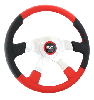 18″ Soft Black/Viper Red Leather Rim, Polished Aluminum 4-Spoke, Halo Ring-Red Leather, SCI Horn Button – Black