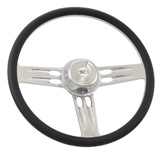 Triple Threat – 18″ Half Wrap Billet Chrome Aluminum 3-Spoke Wheel with Black Leather Wrap, Chrome Bezel and Horn Button with Logo