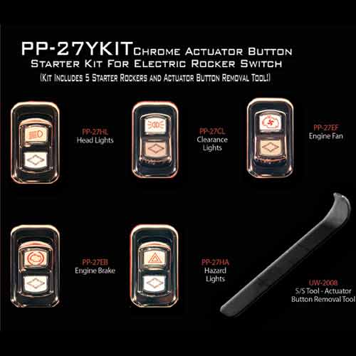 Peterbilt Chrome Illuminated Actuator Button Set – Illuminated by LED – Includes Headlights Button, Clearance Lights Button, Engine Fan Button, Engine Brake Button, Hazard Lights Button, & Actuator Button Removal Tool – Fits 2006 & Newer