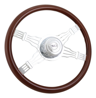 18" Mahogany Rim, Chrome 4-Spoke with Wire Cut Outs Steering Wheel, Chrome Bezel, Chrome Horn Button 3-hole Wheel